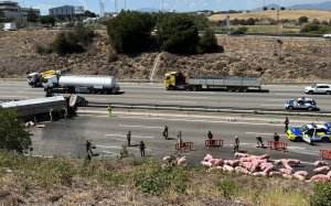 Alerta: porcs a l'autopista. Un camió que transportava aquests animals ha bolcat aquest dilluns al migdia a l'AP-7, al seu pas per Santa Perpètua de Mogoda (Vallès Occidental). A l'accident s'hi han vist implicats un turisme i el vehicle pesant que ha acabat travessat i en flames a la mitjana. S'ha incendiat la cabina. Segons han informat els Bombers de la Generalitat, el cos d'emergències ha activat vuit dotacions terrestres i un helicòpter que s'han desplaçat fins al lloc del sinistre. El foc ha estat apagat poc abans de les tres de la tarda. També s'han traslladat fins allà efectius dels Mossos d'Esquadra, dels Agents Rurals i de la Policia Local del municipi.