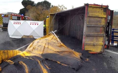 El conductor d'un camió ha resultat ferit crític aquest dijous després de bolcar amb el vehicle al mig de l'autopista AP-7, a l'altura de Gelida, a l'Alt Penedès. Els fets han tingut lloc al voltant de dos quarts d'una del migdia, quan, per causes que a hores d'ara es desconeixen, el camioner ha perdut el control del vehicle i ha acabat bolcat de costat al mig de la calçada. Fruit de l'accident, tota la càrrega que transportava, quilos de quitrà calent, ha acabat escampada per l'autopista. A més, també s'ha produït una important fuita d'oli.