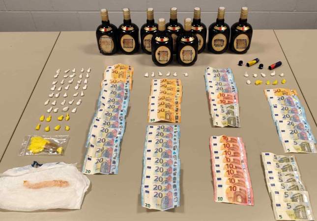 L'actitud nerviosa que mostraven tant el conductor com la seva acompanyant va fer aixecar encara més sospites en els agents, sobretot quan les respostes que van donar a les seves preguntes eren totalment contradictòries. Així doncs, van escorcollar el vehicle, on van trobar amagats 59 embolcalls de cocaïna preparats per a la seva venda al detall. A més, també es van localitzar nou ampolles de whisky, de les quals no en van per acreditar la seva procedència, i un total de 1.215 euros en bitllets fraccionats que portaven a la butxaca i en una bossa de mà.