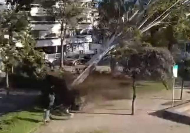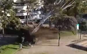 El temporal de vent que aquest dijous ha sacsejat Catalunya, sobretot a l'àrea metropolitana, hauria pogut acabar encara més malament. Les imatges de destrosses en aquestes comarques a tocar de la capital demostren que les ràfegues de vent registrades, que han superat els 100 km/h en molts punts i que s'han enfilat a registres de rècord en altres llocs, posen els pèls de punta. A Castelldefels, i tal com es pot veure en un vídeo gravat pels veïns de la zona de Can Bou, el vent ha arrencat un arbre d'un parc públic en el moment que un home hi passejava amb el seu gos.