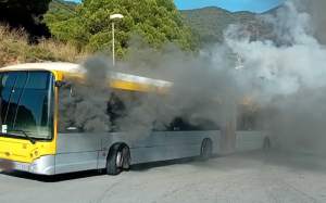 Momentos de tensión los que este sábado por la mañana se han vivido cerca del hospital Can Ruti de Badalona. Pasaban pocos minutos de las doce y cuarto del mediodía cuando uno de los autobuses que hace la línea entre la ciudad y el centro hospitalario se ha incendiado mientras estaba circulando por la carretera del Canyet. El fuego se ha originado por causas que a estas alturas se desconocen y el conductor ha reaccionado muy rápido intentando apagar las llamas él mismo. Sin embargo, no lo ha conseguido y rápidamente se han desplazado hasta el lugar cuatro dotaciones de los Bombers de la Generalitat, que tienen el parque en la misma carretera de acceso al hospital.
