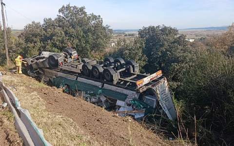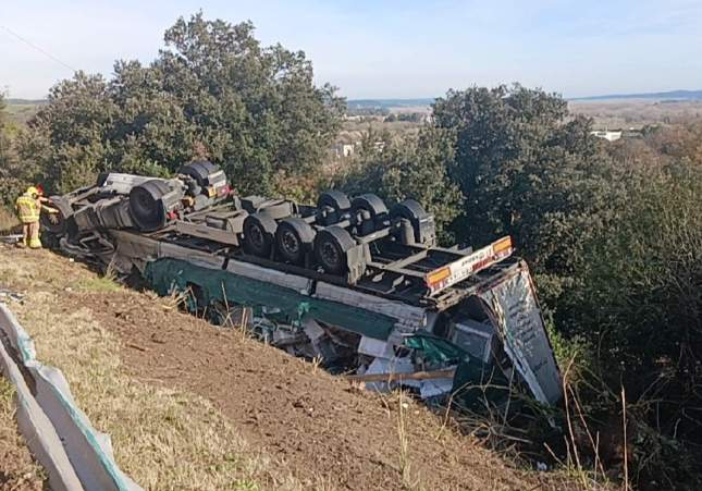 Las personas que hayan pasado por la N-II este mediodía pueden haberse topado con una imagen que pone los pelos de punta. Tal como se puede ver en la portada de la noticia, un camión ha salido de la carretera y ha acabado volcado, completamente tumbado, en un talud en el punto kilométrico 723.8 de la carretera, a la altura de Sant Julià de Ramis, en el Gironès. El conductor, un hombre, ha quedado atrapado dentro del vehículo y se le ha tenido que rescatar. Afortunadamente, los Bombers lo han podido sacar de allí en cuestión de minutos, y cuando el Sistema d'Emergències Mèdiques (SEM) lo ha atendido, lo han diagnosticado herido leve.