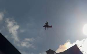 Como el Sistema d'Emergències Mèdiques no ha podido evacuar al hombre del edificio, han pedido ayuda a los Bombers de la Generalitat, que se han desplazado con seis dotaciones. En un primer momento, los efectivos han intentado rescatar al hombre con la autoescala, pero, debido a la altura de la planta donde se encontraba el obrero accidentado, no se podían garantizar las medidas de seguridad. Finalmente, los Bombers han decidido activar el helicóptero y de esta manera facilitar el traslado del hombre hasta el Hospital Doctor Josep Trueta. En la intervención ha participado también el Grup d'Actuacions Especials dels Bombers (GRAE). Los médicos, por suerte, no temen por la vida del hombre y su pierna, a pesar de haber sufrido una herida considerable, no tendrá que ser amputada.
