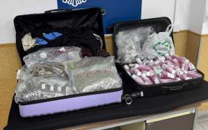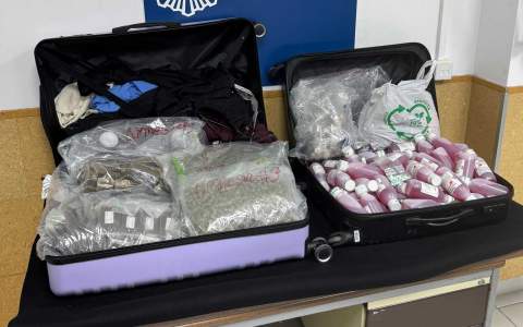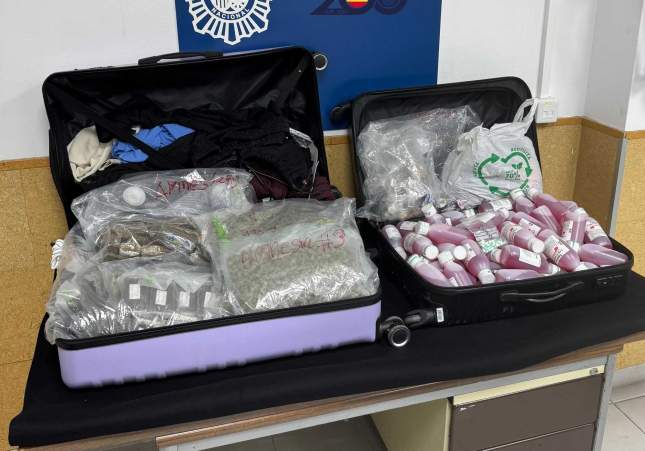 Al abrir las dos maletas que llevaba la mujer, se encontraron 90 pastillas de hachís, así como diecinueve sobres individuales y cinco botes pequeños con la misma sustancia, en total unos 10,289 kilos. Además, también había 1,4 kilos de marihuana y 86 sobres individuales "gummy some loves", 29 cápsulas de anfetamina y 40 botes con 250 ml de codeína, una sustancia utilizada habitualmente para la fabricación de droga. Ante todo esto, la chica, de 26 años, quedó detenida acusada de un delito contra la salud pública por tráfico de drogas.