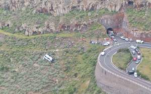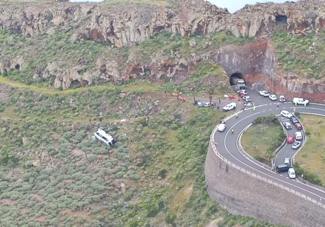 El accidente ha tenido lugar en el kilómetro dos de la vía, en una curva. Tal como se puede ver en la fotografía de portada de esta noticia, el autobús —la guagua, como le llaman allí— ha salido de la carretera por motivos que de momento se desconocen y ha caído por el terraplén. Rápidamente, se ha avisado a los servicios de emergencias y unidades de bomberos, policías y sanitarios han ido hacia allí. El accidente ha sido grave: una persona ha muerto a causa del impacto y al menos catorce han resultado heridas, tres de ellas en estado grave. En el lugar de los hechos asisten un helicóptero medicalizado, tres ambulancias -dos de soporte vital avanzado-, equipo médico del centro de salud y dos ambulancias de TSNU, que están tratando a los heridos y trasladándolos al hospital.